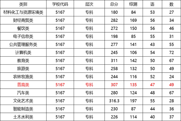 泸州职业技术学院的单招录取分数线,普高至少要307分,而职高至少也要180分,如果你参加高考,四川文科高考生,则至少需要441分,理科431分才能被“省重点”综合大学录取。以下是2024年泸州职业技术学院各专业类别录取分数线: