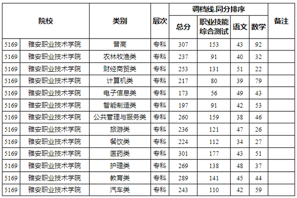 雅安职业技术学院2024年单招各类别录取分数线: