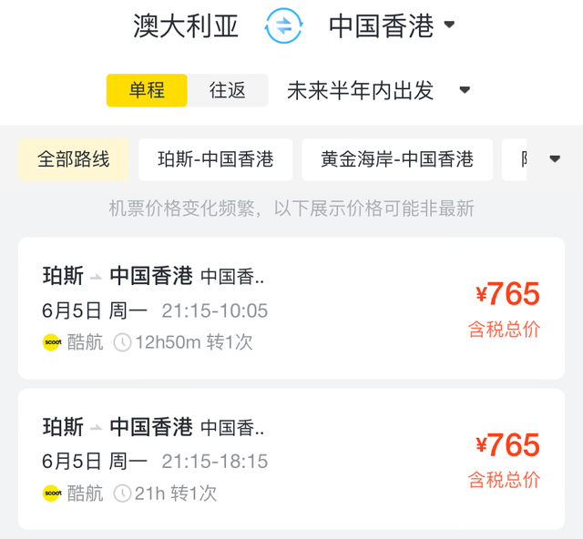 飞猪APP上澳洲回国的航班,更是惊现人民币¥765元!!!