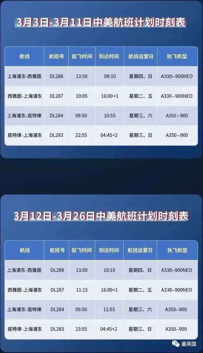 达美航空自2024年3月3日起取消首尔技术经停正式恢复中美直飞航线,涉及上海浦东=西雅图、上海浦东=底特律航线,最新时刻表如下: