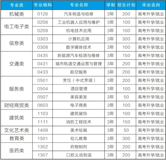 学校开设药物制剂、新能源汽车检测与维修、建筑装饰、幼儿教育、数字媒体应用计算机应用、汽车制造与装配、航空服务、城市轨道交通运输与管理等18个专业。