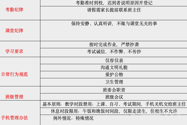 手机管理特别说明:统一时间收发(周日晚上返校六点半收,下周六周考结束发),禁止上课时间使用手机。