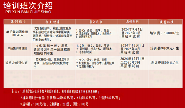 1、专业的师资团队:学校聘请了从业多年、专注单招教学经验的语文、数学、英语老师进行倾力培训,全天文化课正课轮流教学,全职教师在校与学生共同成长。