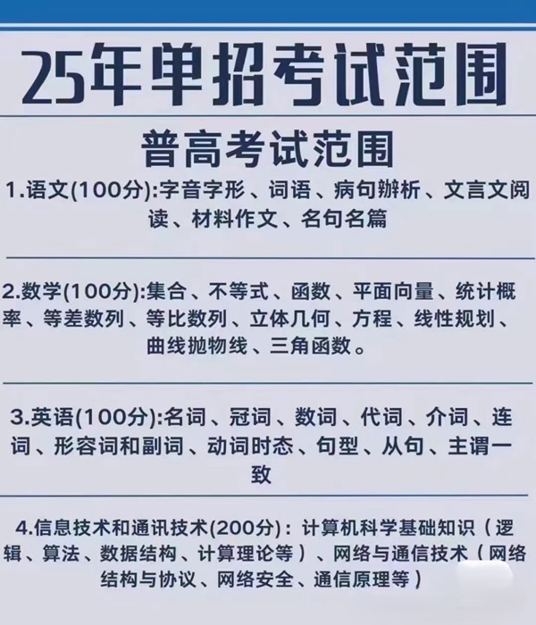 摘要:成都明阳单招培训学校作为一家专业的高职单招培训机构,2025年单招集训班开设课程有语数外、通用技术和信息技术等,明阳单招拥有丰富的单招教学经验,在培训方面也有独特的复习技巧。 详细咨询电话:18080070332(吴老师)! 四川单招考试范围: 明阳单招复习技