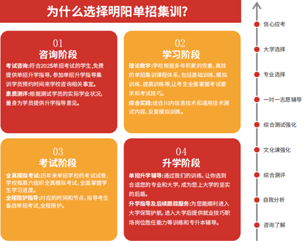 成都明阳单招培训学校秉承“低分高出,以公办院校为目标”的教育理念,为每一位同学提供更加专业、个性化的学习指导与职业规划服务。多年来,我校高职单招集训班达到98.7%的高录取率,2024届“签约班”更是达到100%的录取率。咨询电话——18080070332(张老师)!