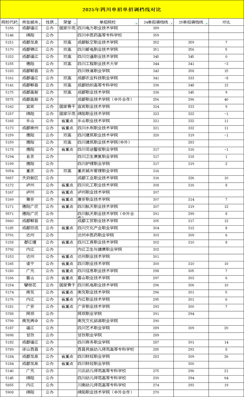 2025年与2024年单招调档线对比: