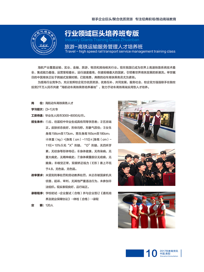铁路是国民经济的大动脉,中国列车还在提速,时速380公里新一代动车组又将下线,时速500公里的实验高速动车组正在研发,目前,中国是世界上调整铁路系统最全、集成能力最高、在建规模最大的国家,举世瞩目的中国高铁正处于跨域式发展时期,以致高贵、典雅的列车乘务员、客运人才尤为紧俏。
